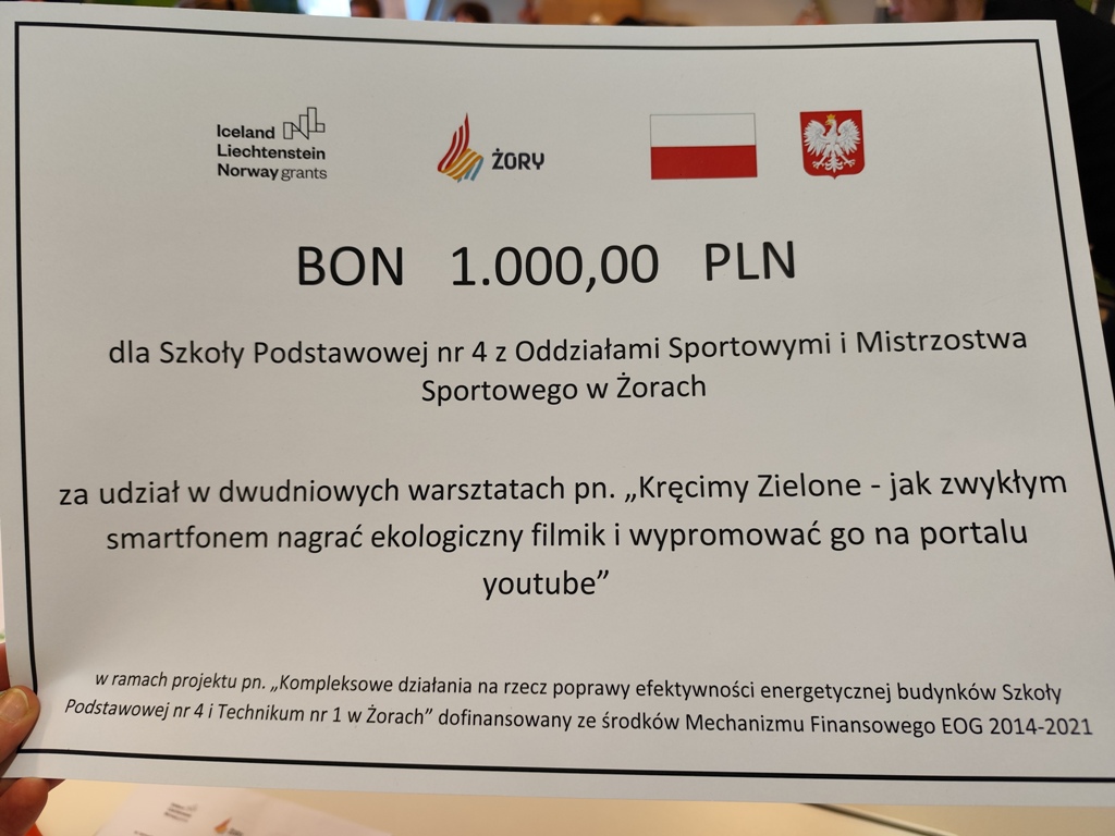 As part of the project entitled “Comprehensive actions to improve the energy efficiency of buildings of Primary School No. 4 and Technical School No. 1 in Żory”, workshops were held under the slogan “We are shooting Green – how to record an ecological video with an ordinary smartphone and promote it on YouTube portal”, during which young people recorded videos with an ecological message.